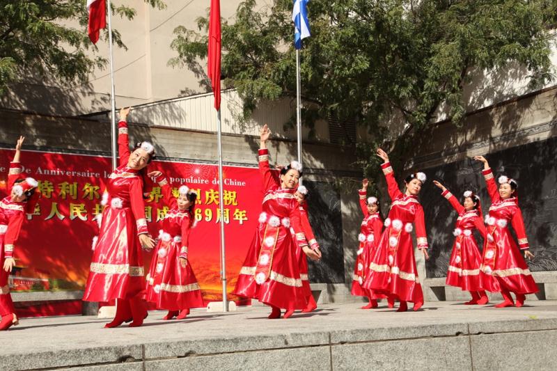 格瑞斯多元文化艺术团参加了此次升旗仪式,并献上了藏族舞蹈:《牧羊姑娘》,优美绝伦的音乐旋律,加上美女们美伦美焕的舞姿,把牧羊姑娘劳动时的意境表演得唯妙唯俏,受到了到场观众的热烈欢迎。在此祝福祖国繁荣昌盛,国富民强,祝福加中两国人民世代友好。
