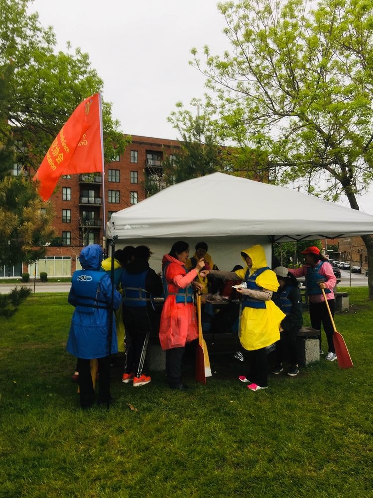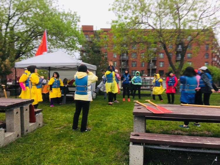 五月二十五日,阴雨连绵,Lachine 运河边,龙舟训练基地,杨亮地产·格瑞斯女子龙舟队的女将们,义工们驱车齐聚训练基地,她们迅速搭起帐篷,带来了美食,欢声笑语中,不惧风雨,服从教练,上船训练,她们每一个人都是首次参加,毫无经验,个个如娇小姐,然而一个小时的训练后,人人似士兵,她们仍然在训练中成长。祝福女队明天更美好。